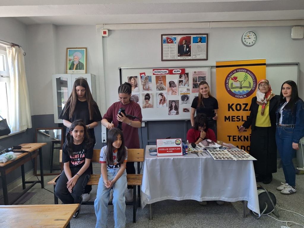 15.05.2025 Perşembe günü ilçemiz okullarından Koza Kız Mesleki ve Teknik Anadolu Lisesi'nin uygulamış olduğu sosyal sorumluluk projesi kapsamında, Güzellik ve Saç Bakım Hizmetleri Alanı usta öğreticileri ve öğrencileriyle beraber okulumuza gelerek 20 kız öğrencinin saç kesim işlemini ücretsiz olarak gerçekleştirmişlerdir.